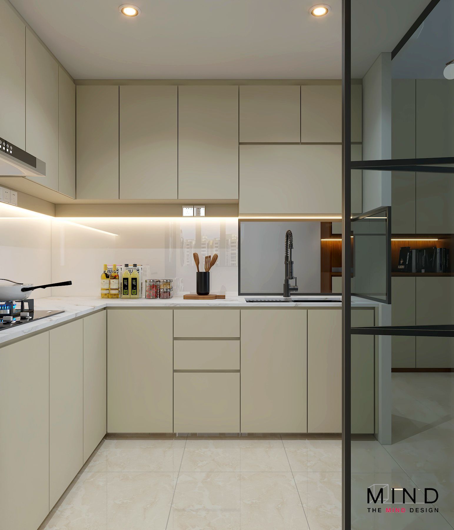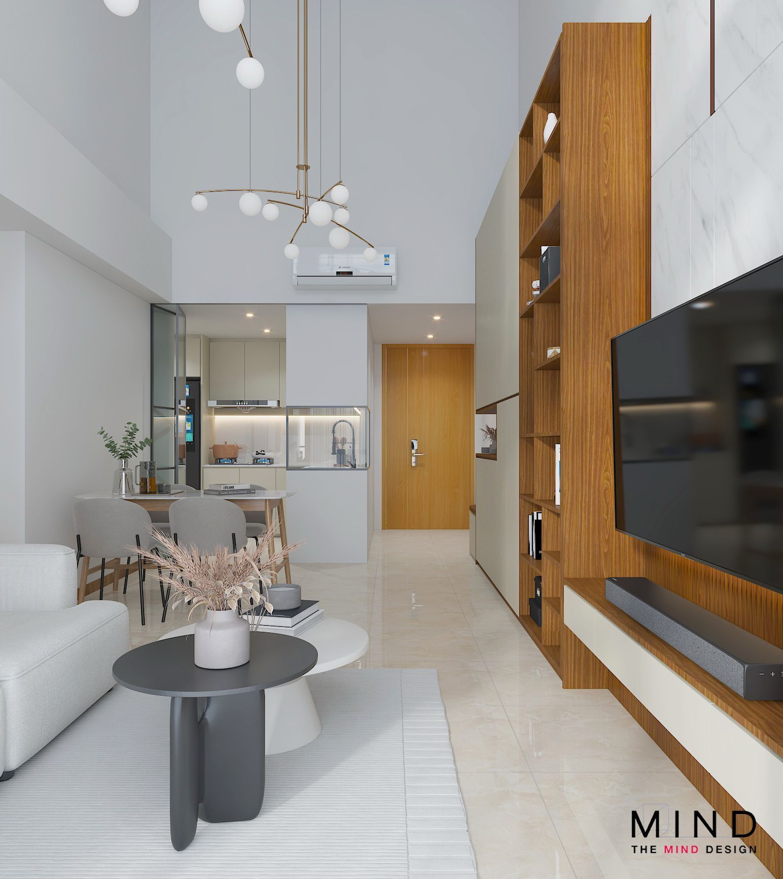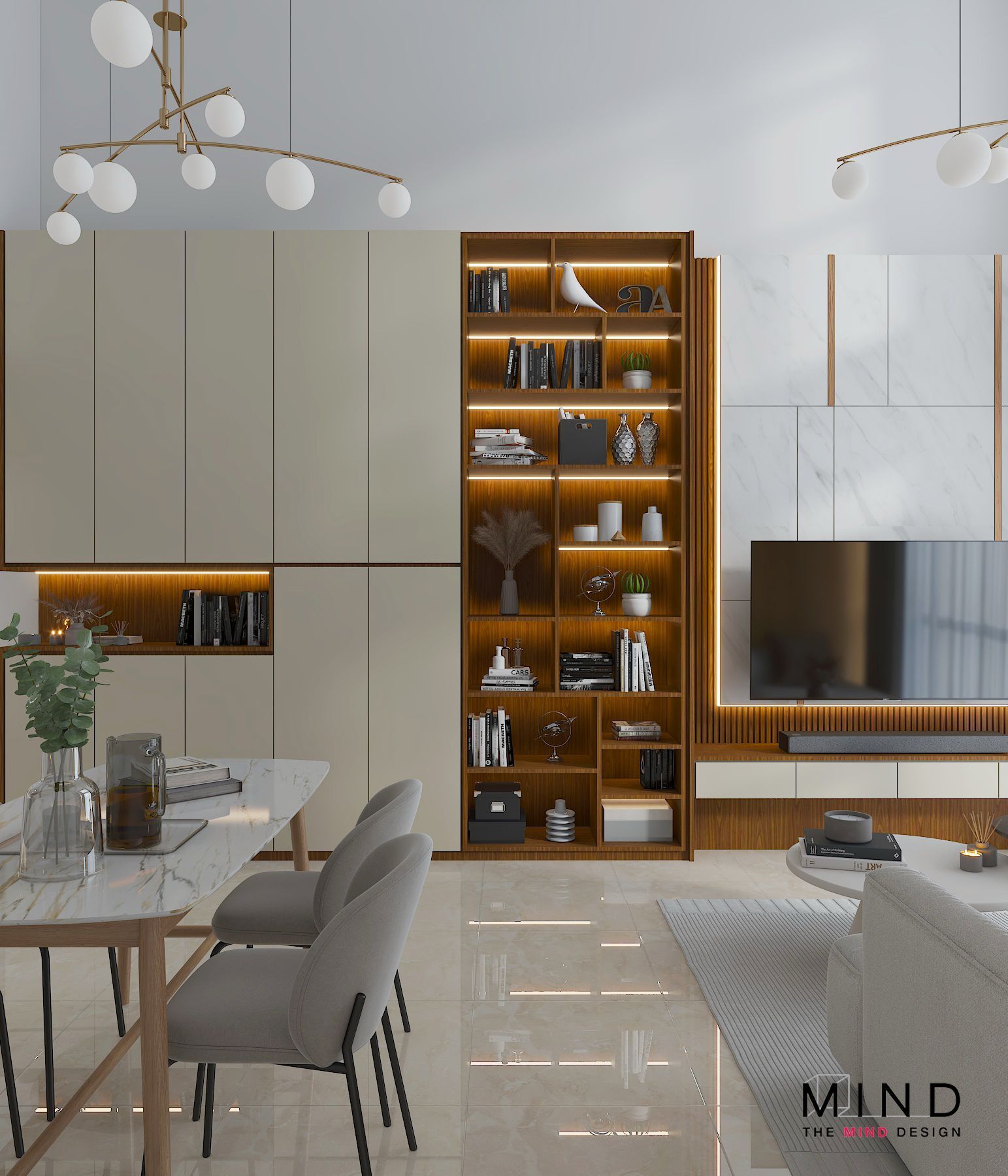 This refined interior captures the true essence of contemporary luxury condo interior design in Singapore. From the sleek marble finishes to the warm, illuminated wooden shelves, every detail is crafted to exude sophistication and style. The clean built-ins, functional storage, and soft neutral palette create a neat and spacious environment—perfect for modern city living.