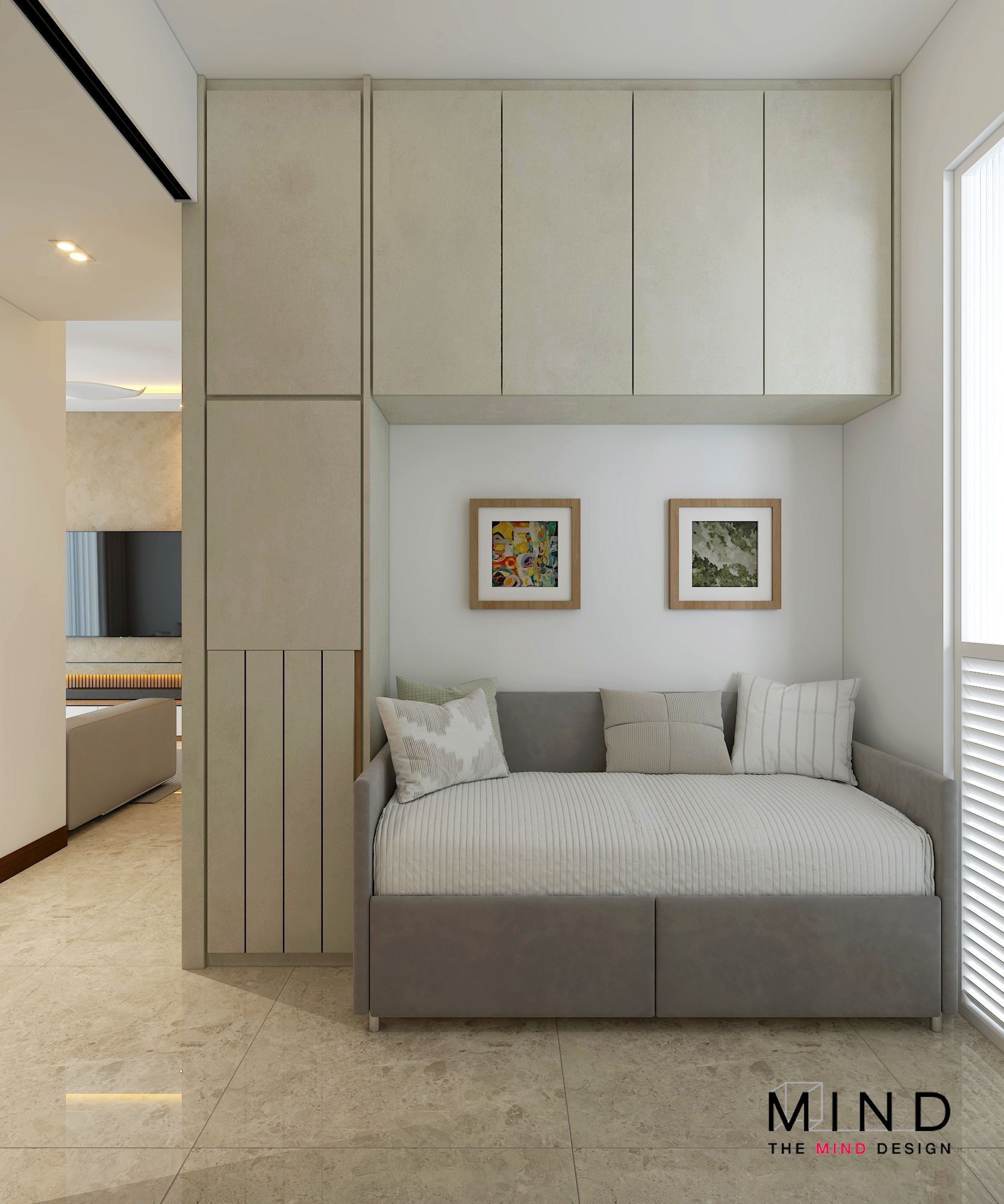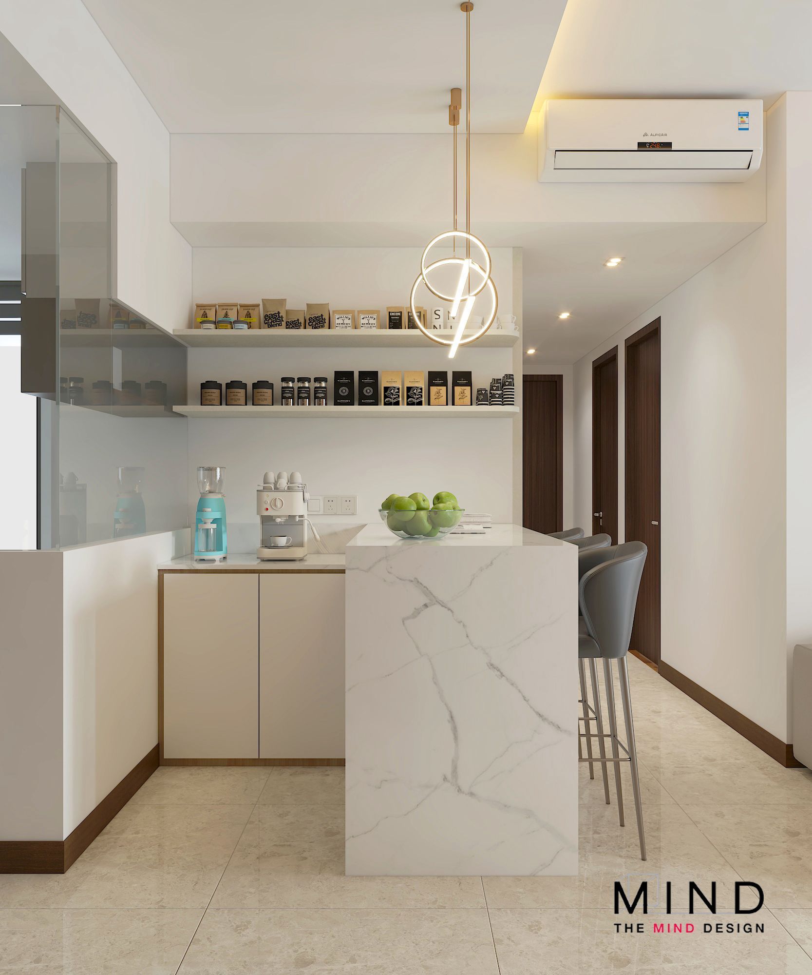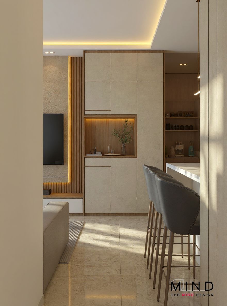 Presenting a glimpse into our exclusive project at Forth Avenue Residences, where small spaces meet grand design. The Mind Design crafted this inviting nook, featuring a sleek breakfast bar and integrated storage.