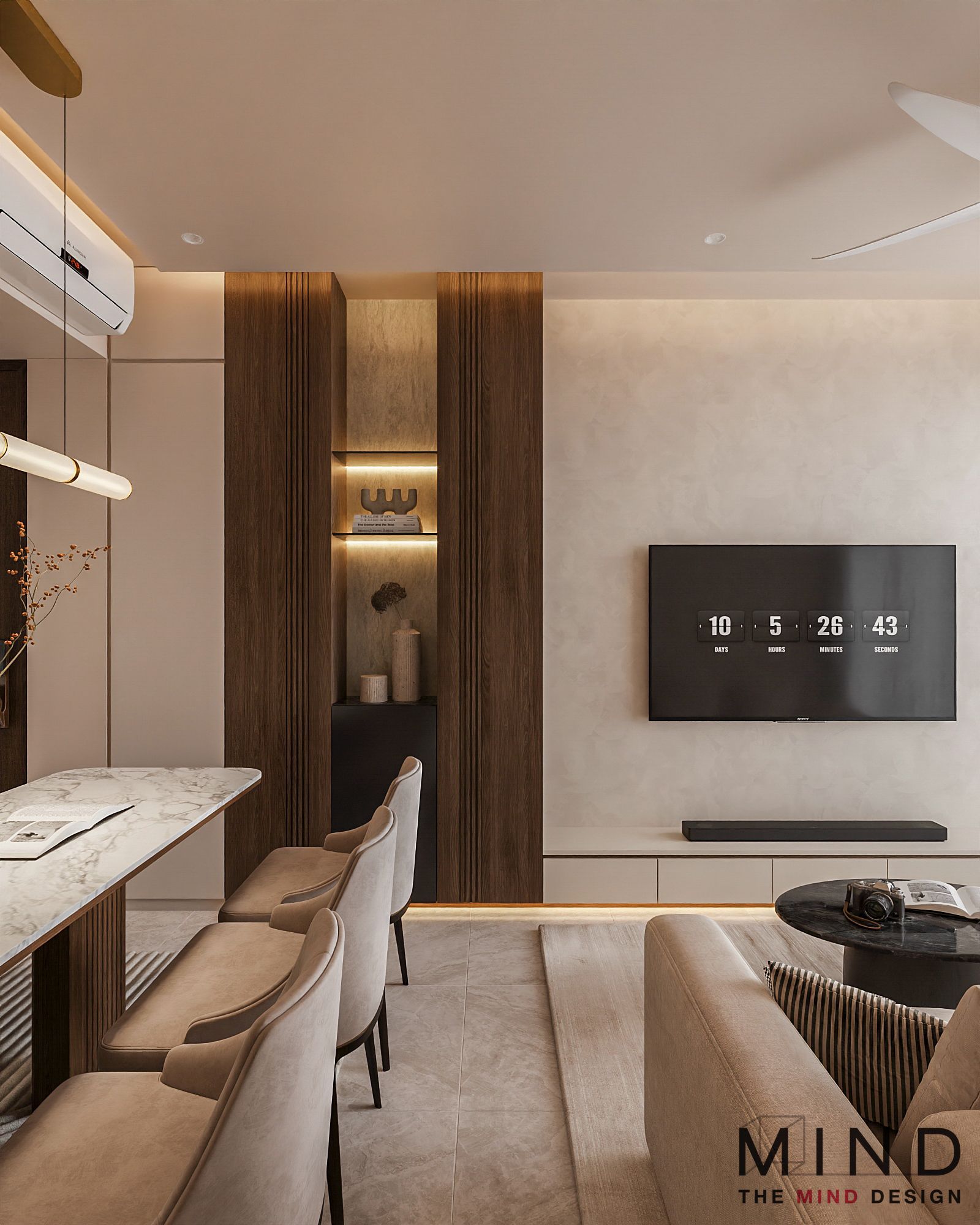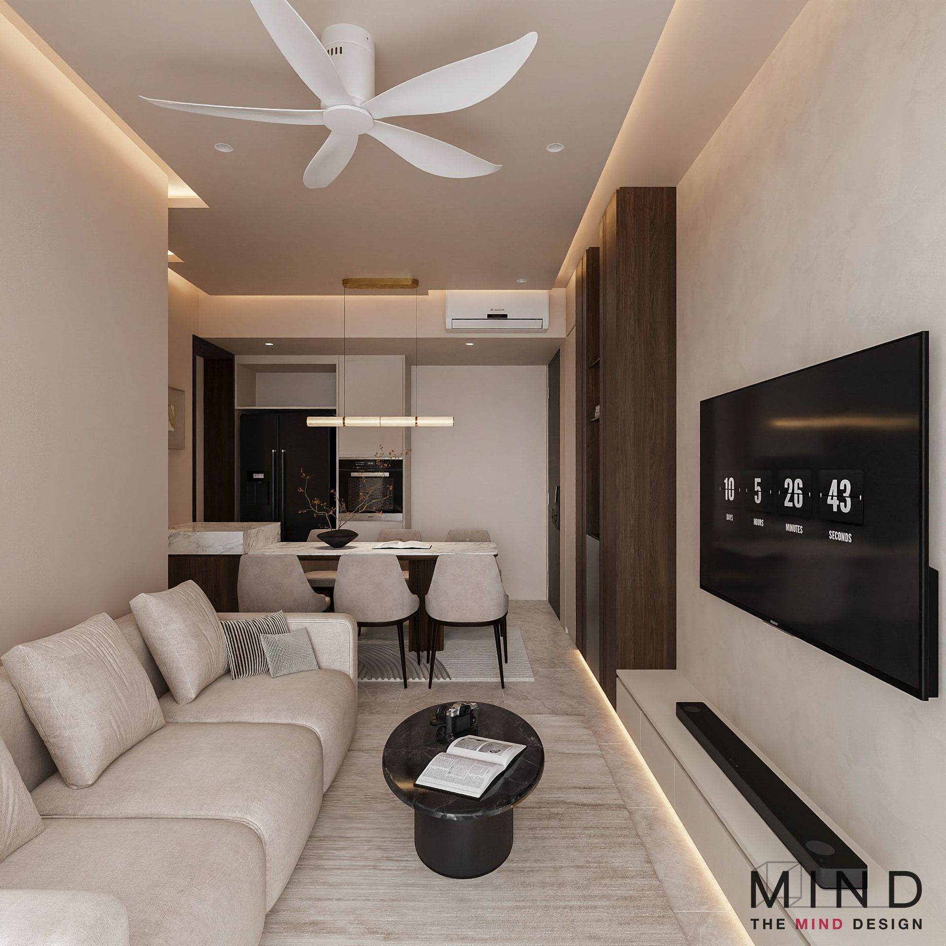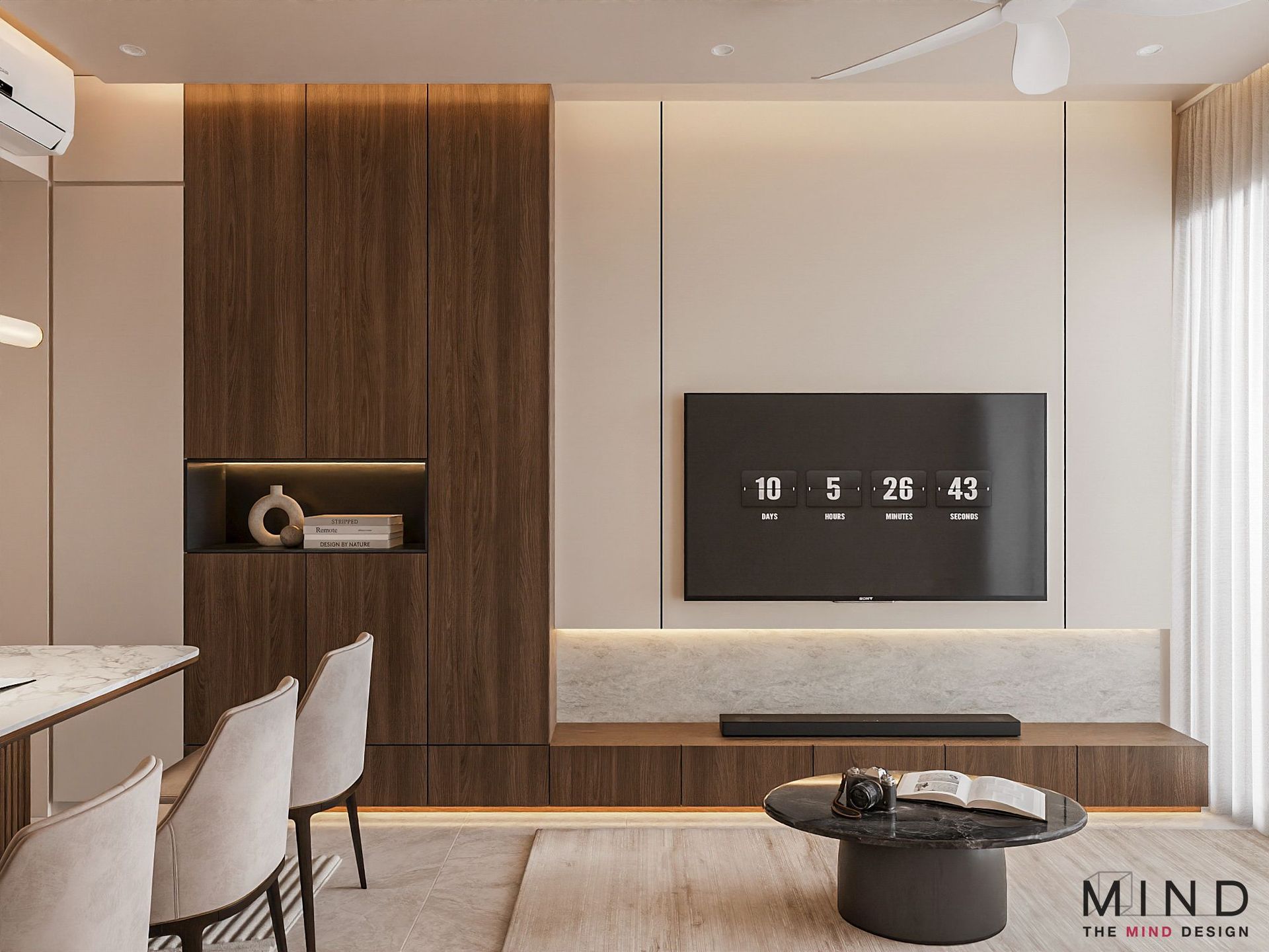 Functional and elegance, sophisticated TV feature wall with breathtaking, double-volume condo loft with seamless glass railings and illuminated wooden stairs. Bright, open-concept layouts and bespoke cabinetry—ranging from warm, illuminated living room niches to bold, industrial-style black shelving units with integrated LED strips—keep these homes looking flawless and clutter-free.