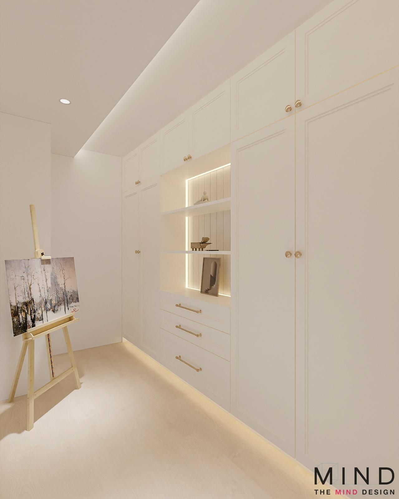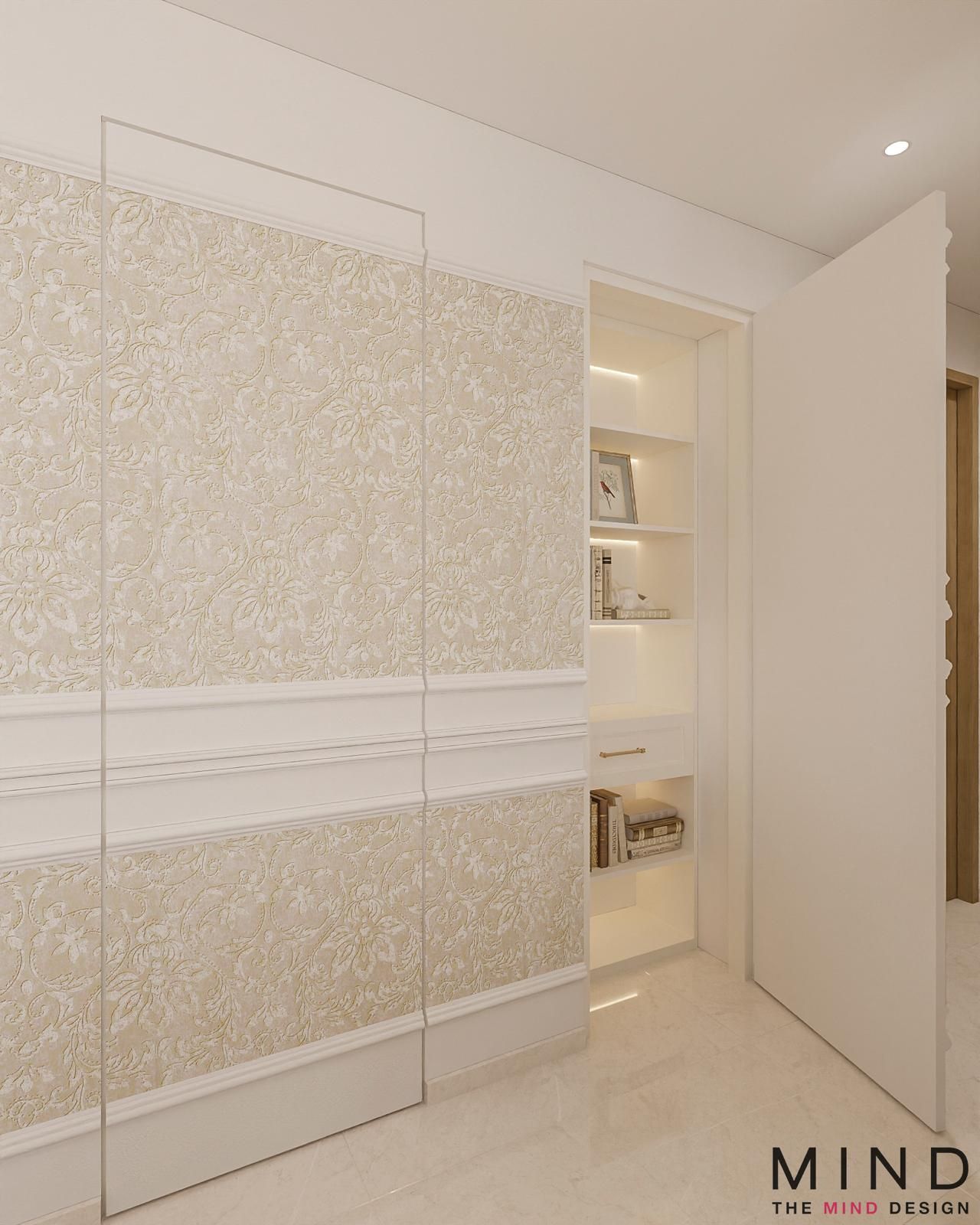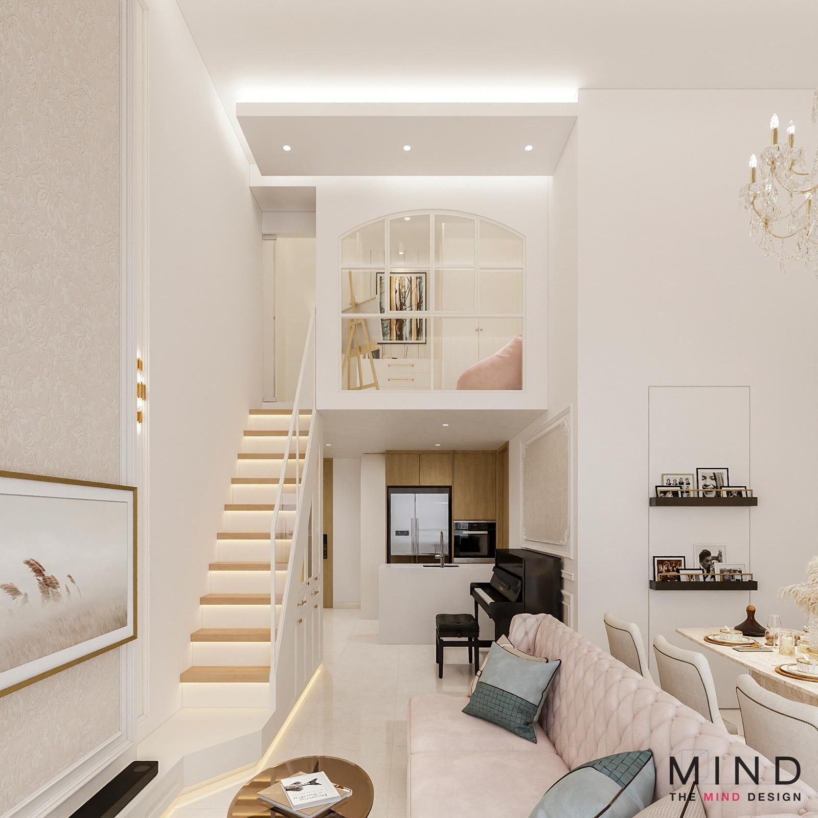 Charming, windowed loft at The Arden - A dramatic, concrete-textured feature wall with industrial-style shelving. Bright, open-concept layouts and custom cabinetry—from fluted wood TV panels with lit display niches to warm, glass-framed loft staircases.