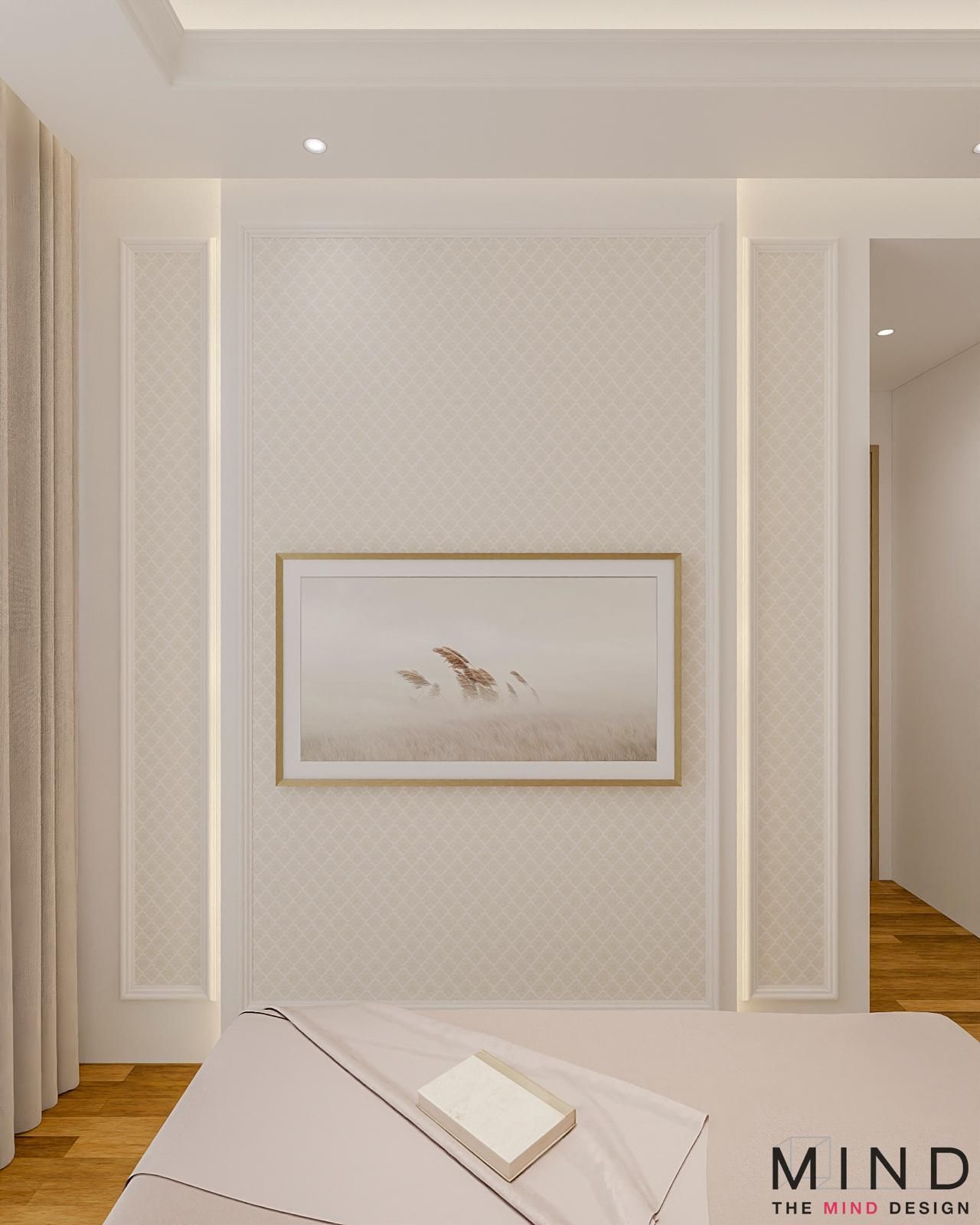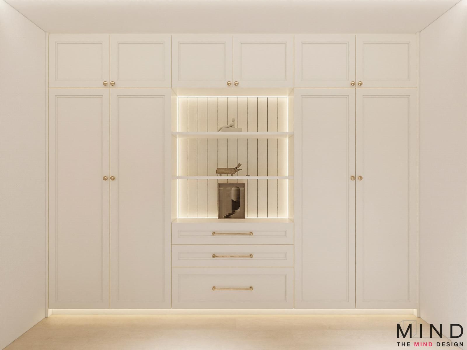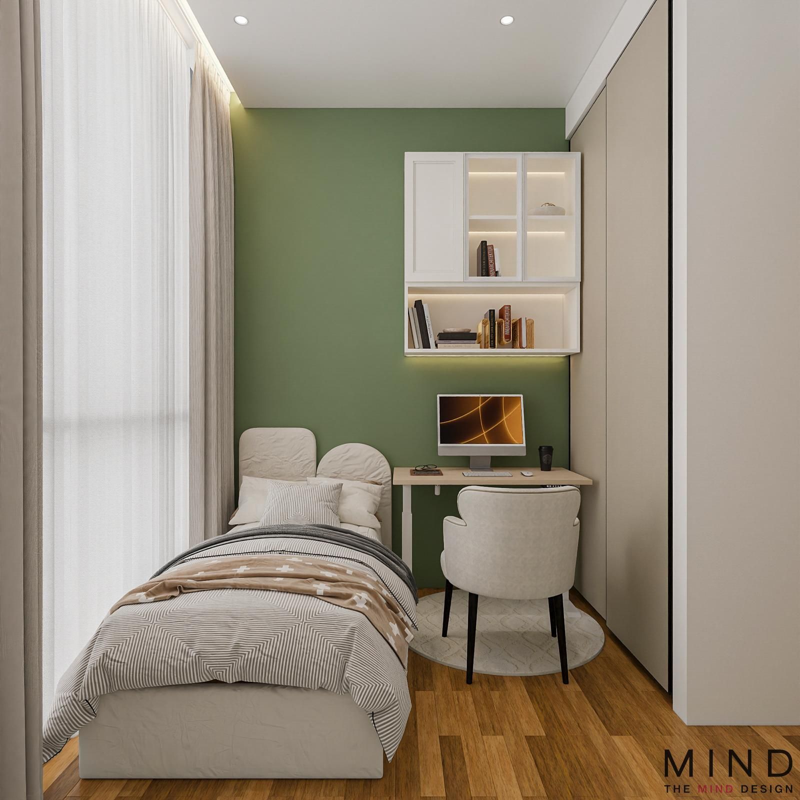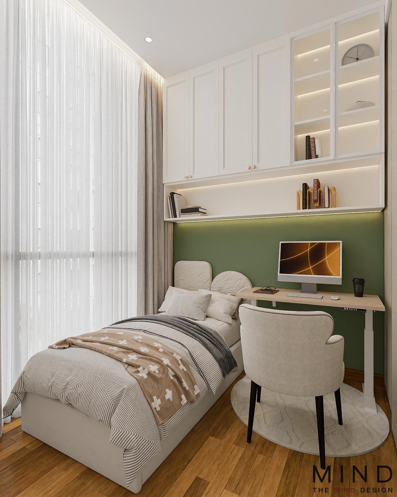 Charming, windowed loft at The Arden - A dramatic, concrete-textured feature wall with industrial-style shelving. Bright, open-concept layouts and custom cabinetry—from fluted wood TV panels with lit display niches to warm, glass-framed loft staircases.