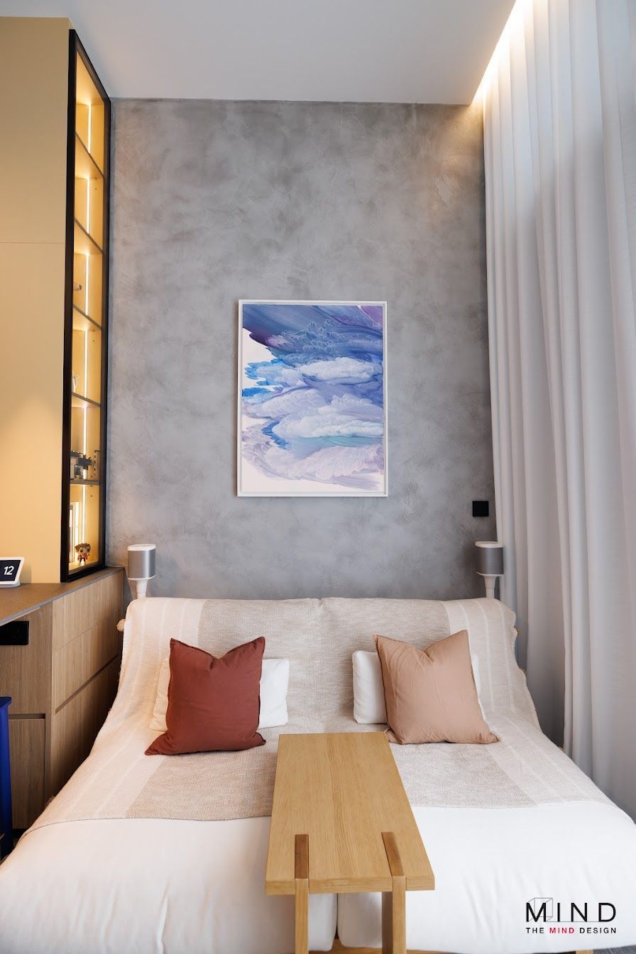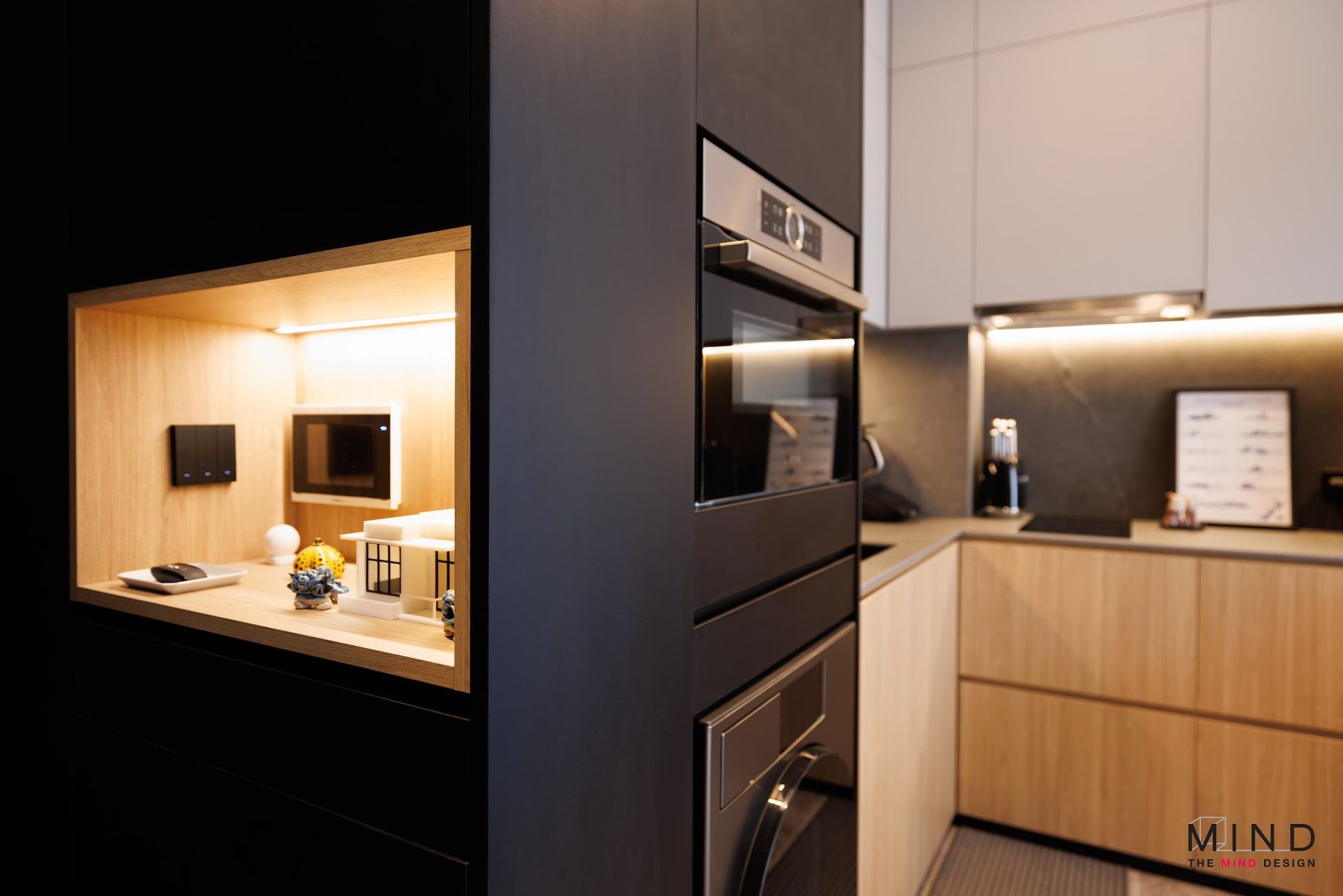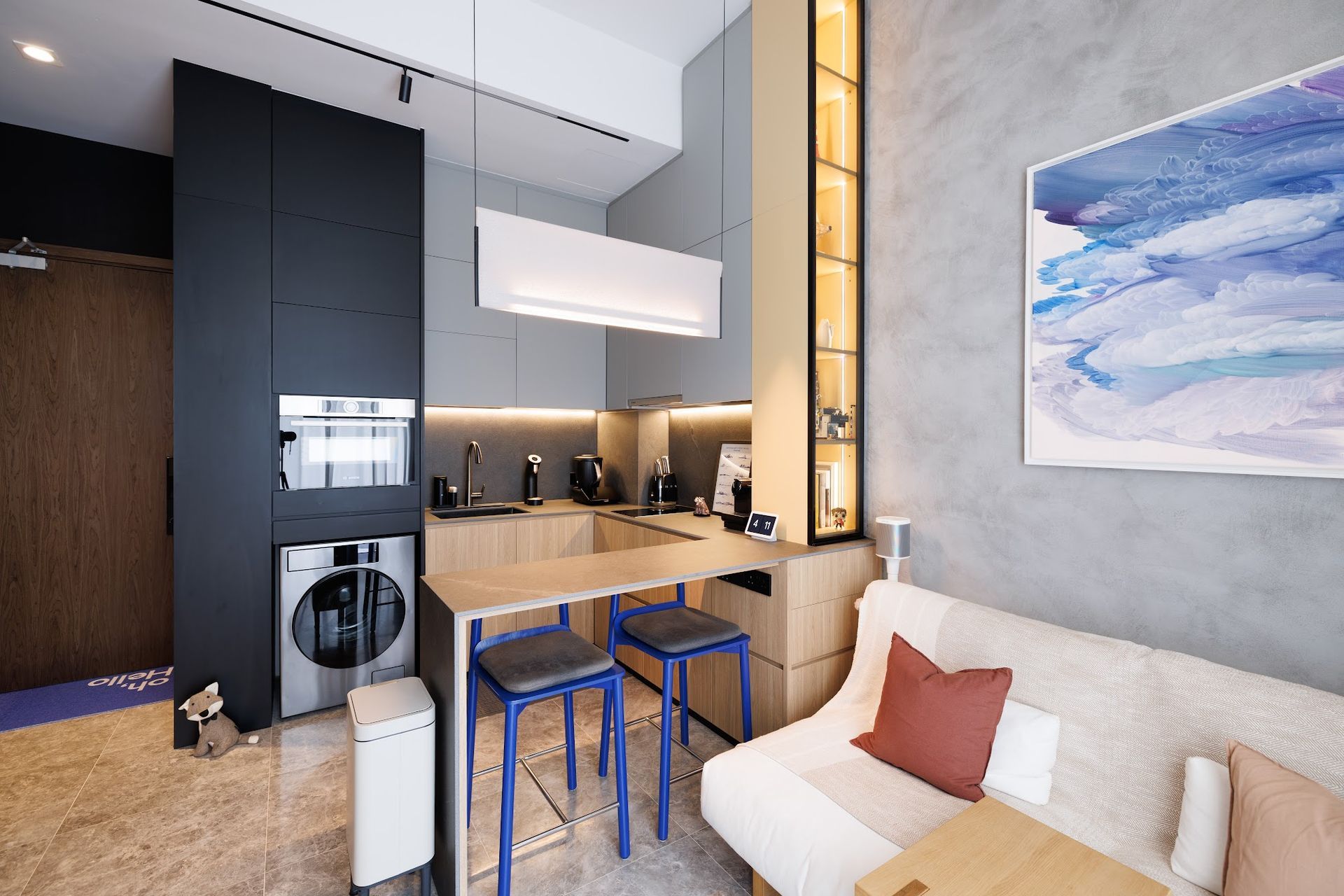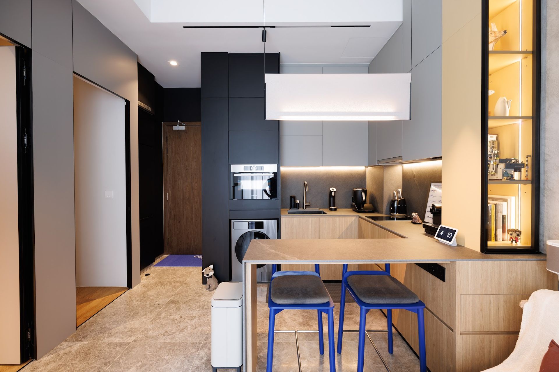 This project demonstrates the power of smart integration, where a sleek, stone-topped kitchen island transitions seamlessly into a cozy living sanctuary defined by textured concrete-effect walls and warm timber cabinetry. By utilizing a clean, linear layout and strategic under-cabinet lighting, we’ve transformed a compact footprint into a high-functioning home that feels both expansive and intimate. It is a perfect example of how thoughtful design can maximize every square foot of a premium Singapore condo without compromising on modern sophistication.